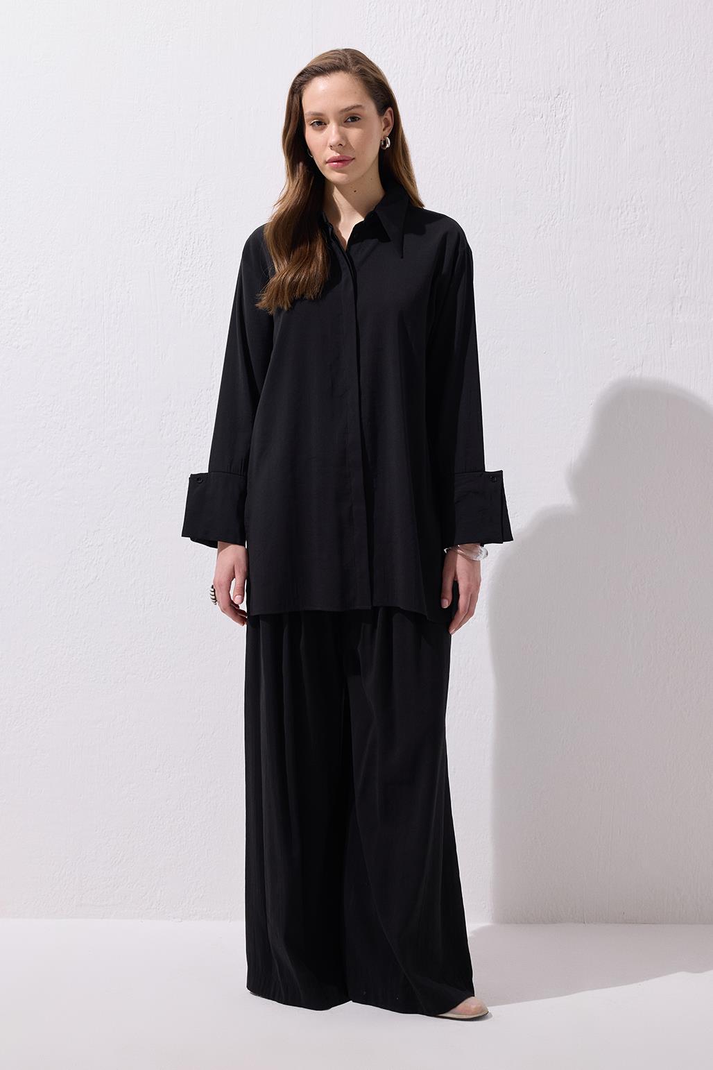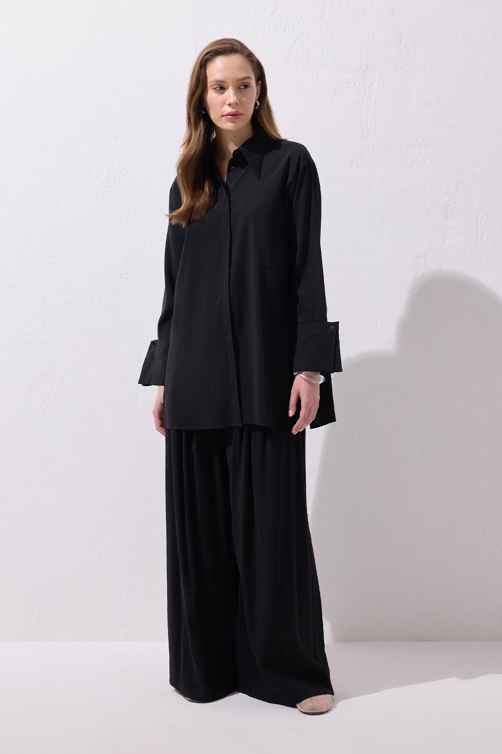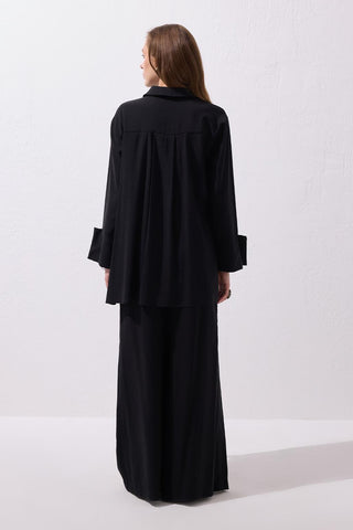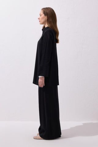 The Modal Basic Shirt in Black offers a perfect balance of simplicity and sophistication with its draped modal fabric and classic collar design. The wide cuff details and the cut form at the back yoke add a minimal yet distinctive touch to the design. Its straight cut ensures a flattering fit for various body types, while the button placket allows you to layer it over a basic tee for a more styled look, or pair it with draped trousers for a modern silhouette. This piece is set to become an essential in your daily wardrobe, ideal for those seeking elegance through simplicity.
