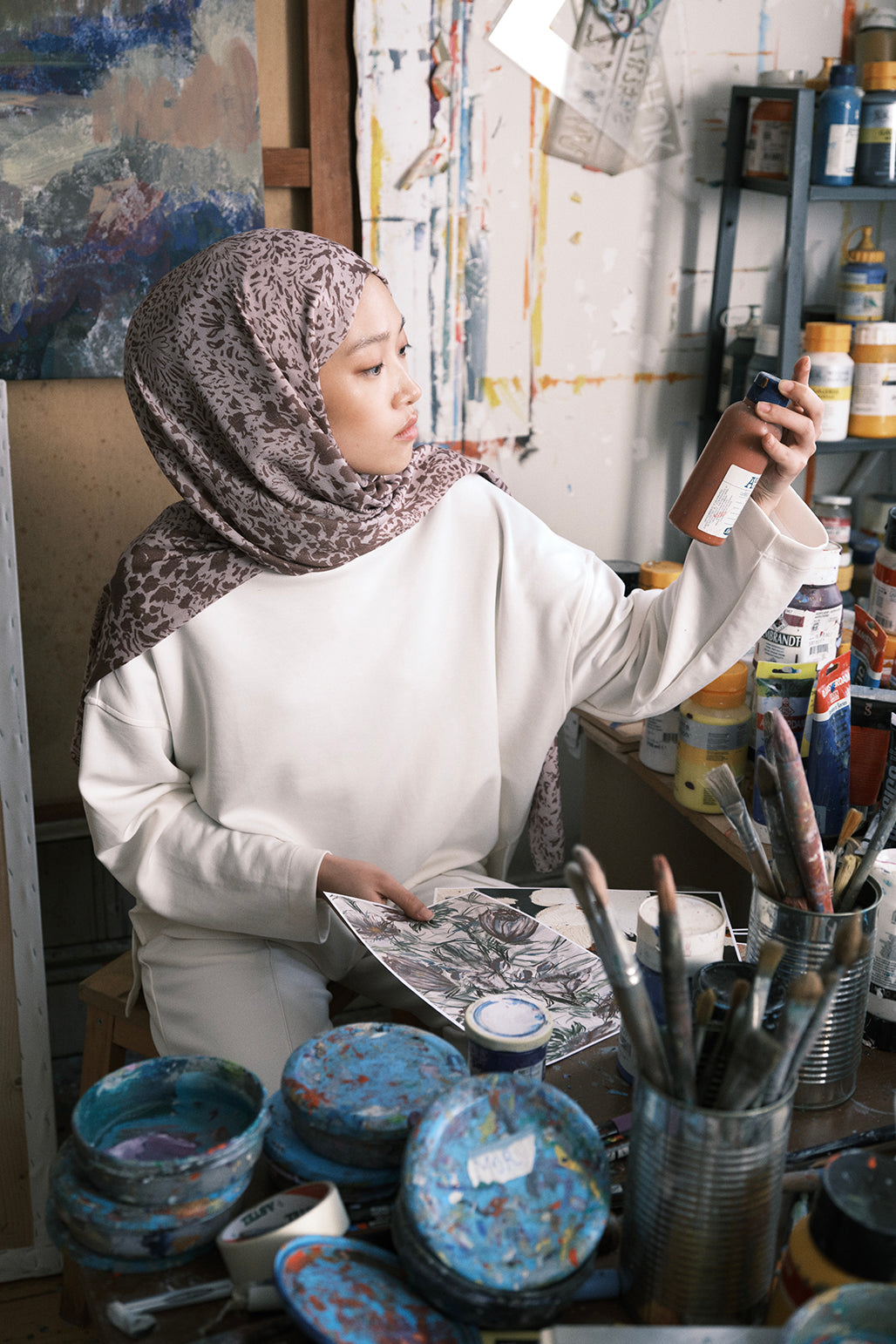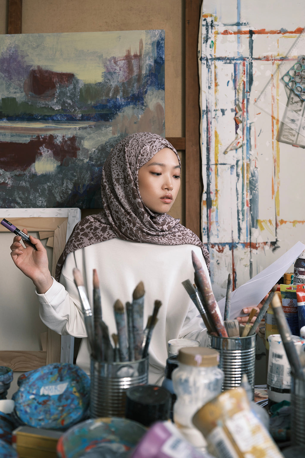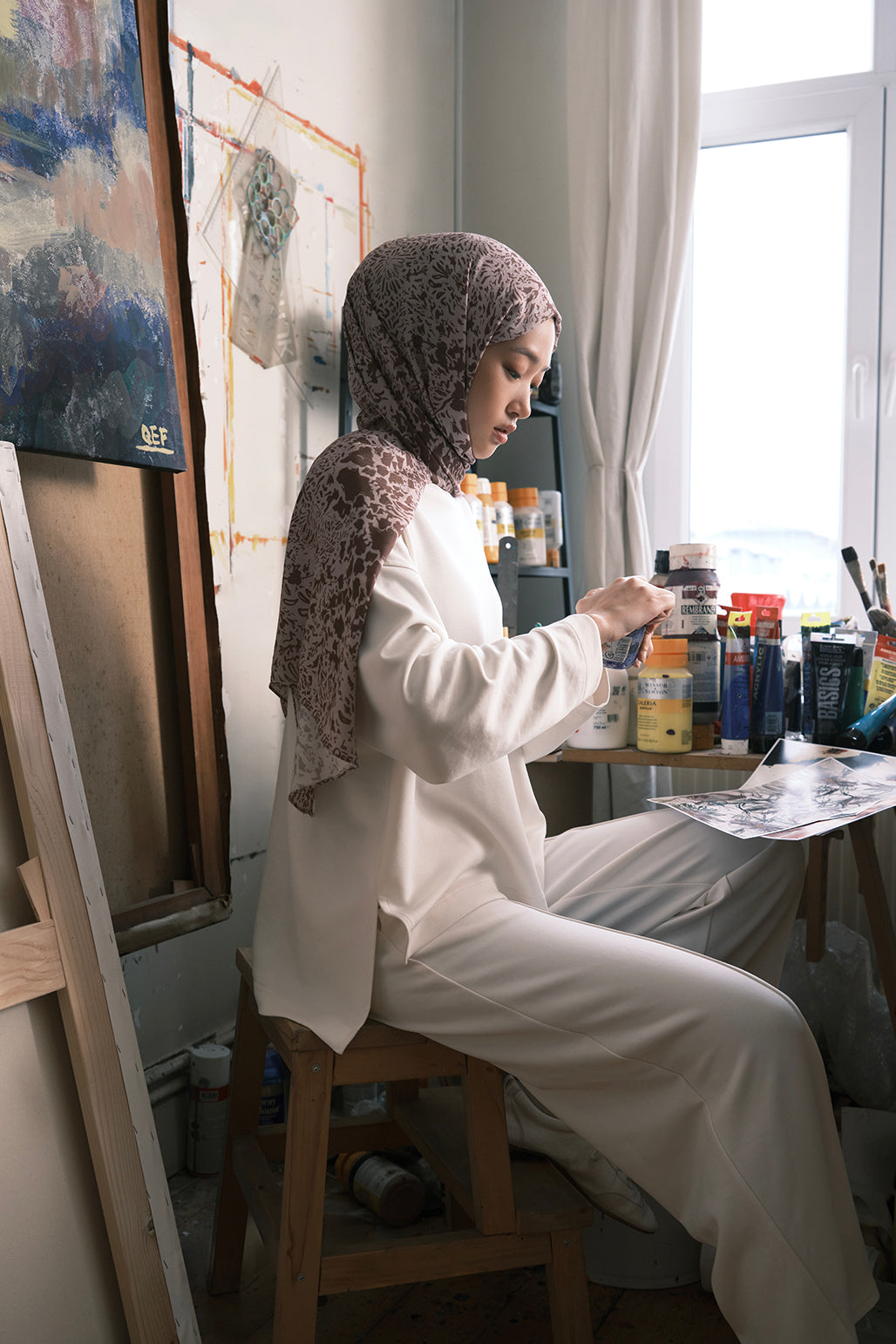 The Patterned Modal Brush Shawl features distinctive designs inspired by the intersection of imagination and dreams, captured through a painter's creativity. The patterns, enhanced by vivid brush strokes and intricate details, are one-of-a-kind works of art, each conveying a unique story. Every detail reflects the artist's personal interpretation, creating a striking visual aesthetic reminiscent of a canvas painting. Crafted from soft modal fabric, this shawl offers both elegance and comfort.