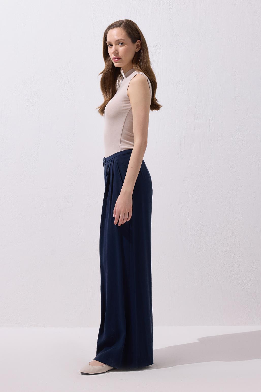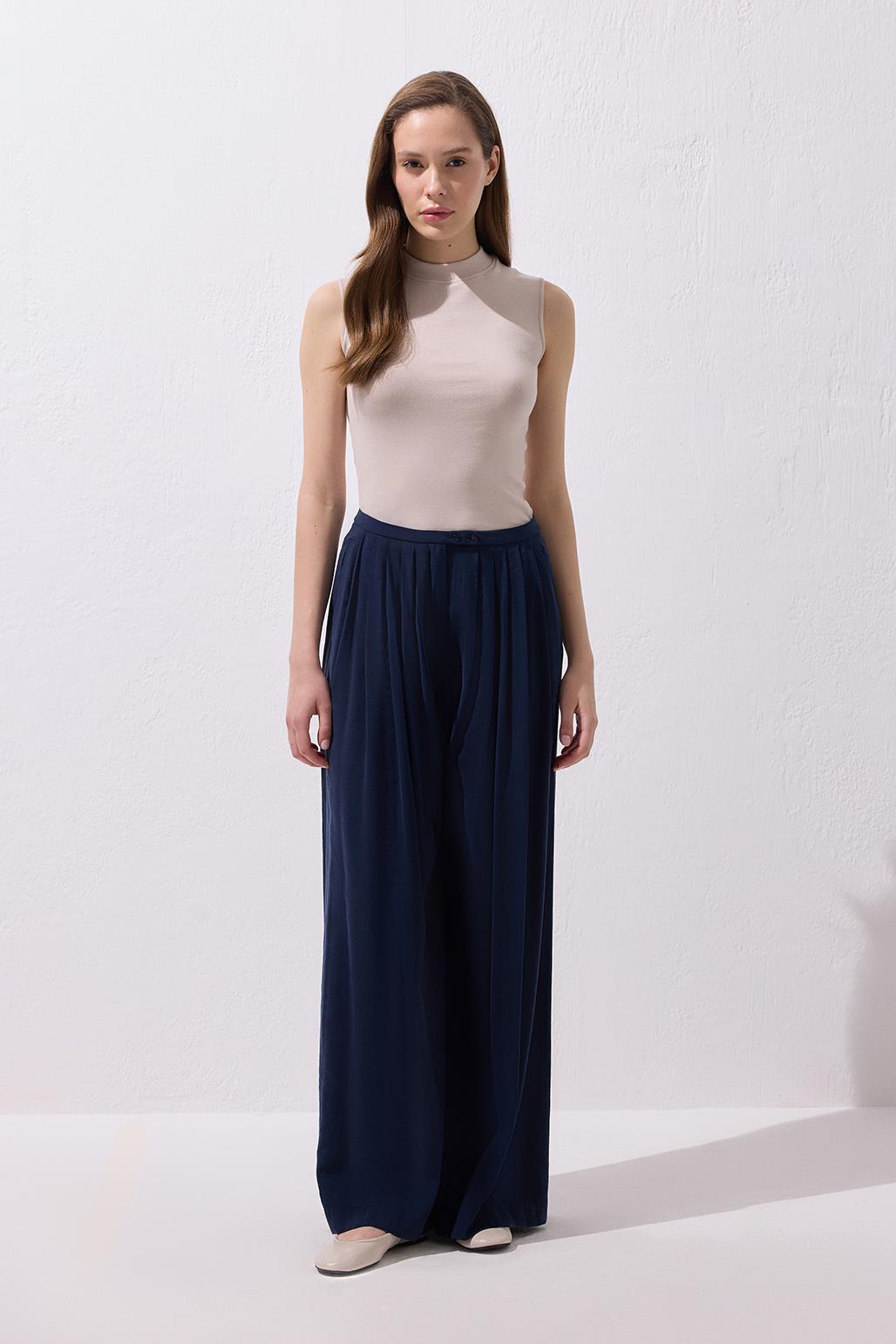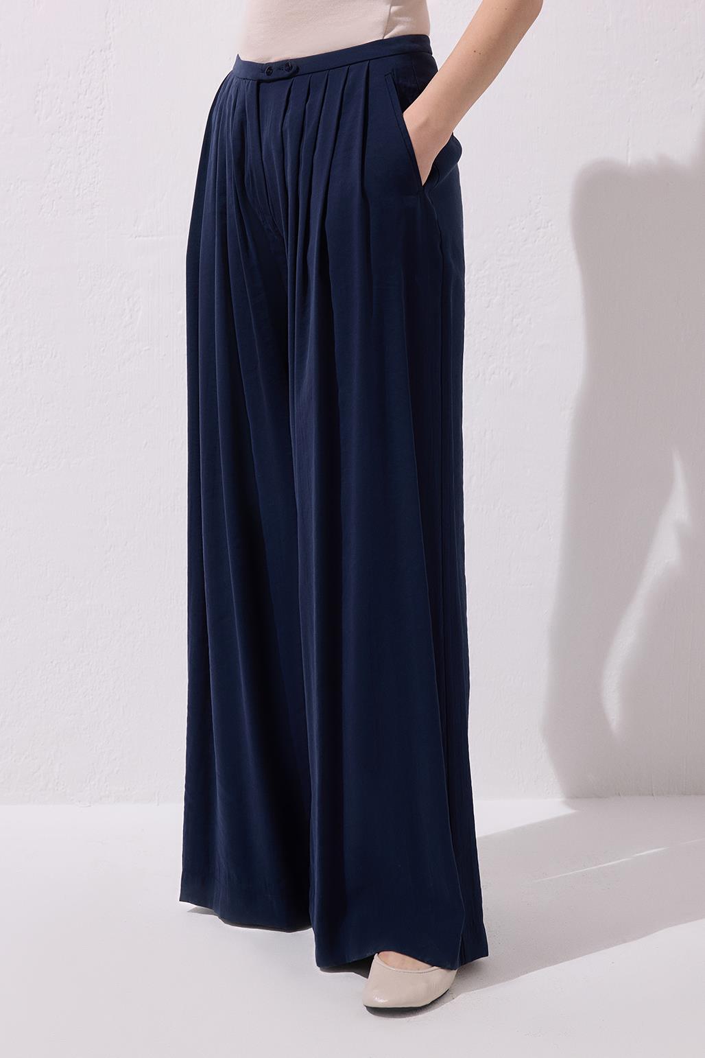 The Modal Wide Leg Trousers in Navy Blue offer a graceful movement with their flowing modal fabric and extra-wide leg cut. The mid-rise waist and pleated design create a modern, balanced silhouette, while the light texture ensures comfort throughout the day. You can create a minimalist summer look with basic tees or achieve a more refined, city-chic style with voile shirts. For those who want to make a statement with clean lines, this piece is sure to become an essential in your wardrobe.
