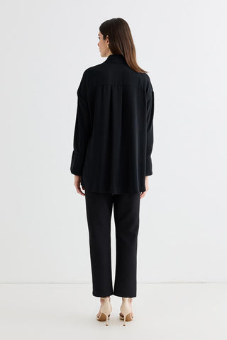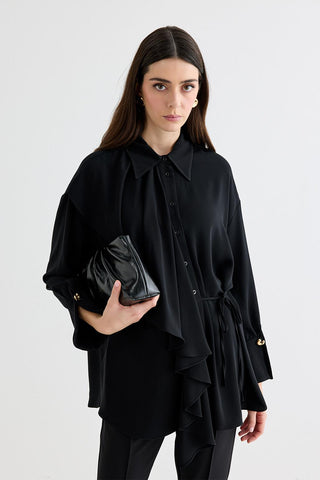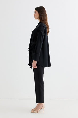 The Morina Ruffled Tied Shirt, crafted from a soft cupro-blend fabric, combines elegance and comfort. Its timeless and romantic design offers a unique style that can be worn for both special occasions and everyday looks. The ruffle details and relaxed fit provide a stylish appearance without being restrictive. Pair it with palazzo pants for a sophisticated style, or create a modern combination with stretch pipe trousers. This piece will become one of the most versatile and eye-catching items in your wardrobe!