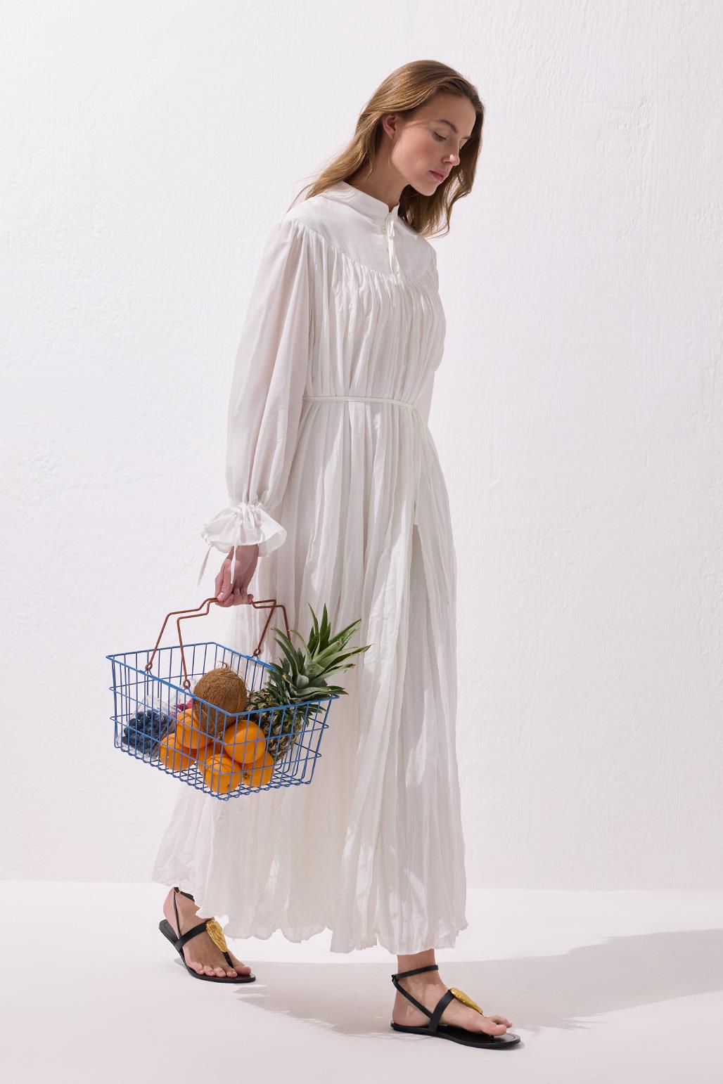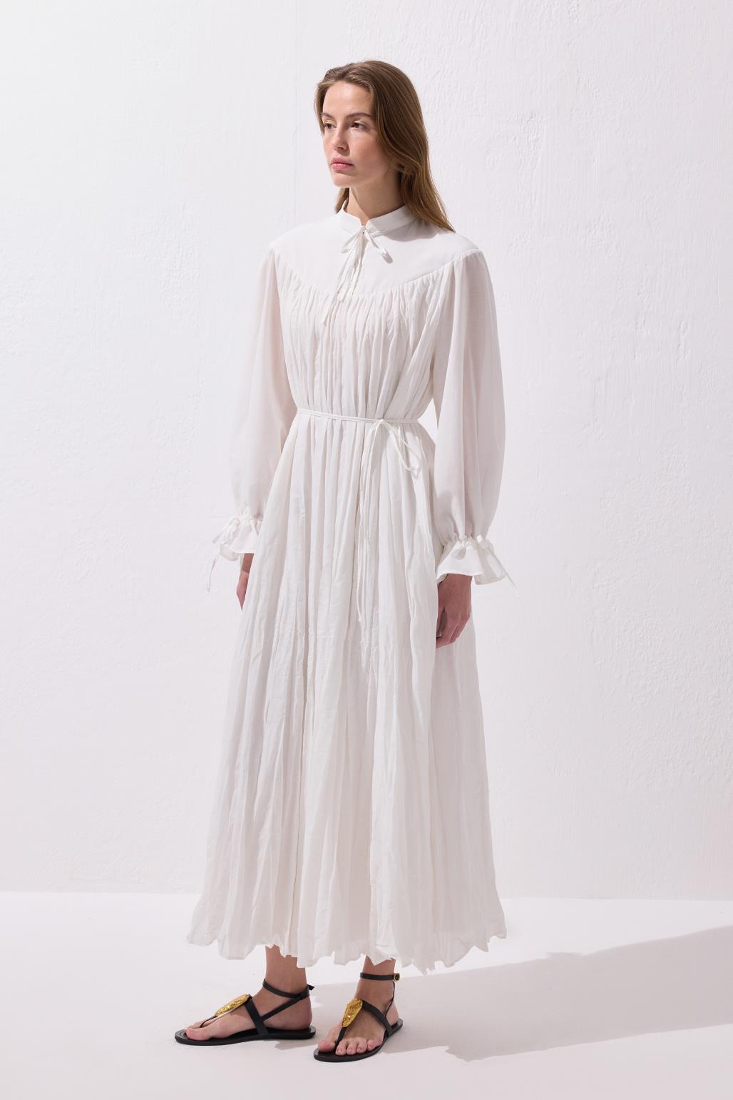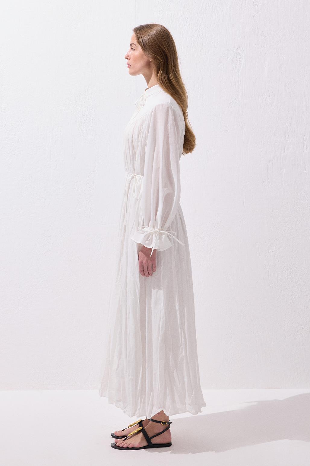 Crinkle-effect voile fabric, lined, high collar, raglan cut, low shoulder design, adjustable gathered sleeve cuffs, removable waist belt, long dress.