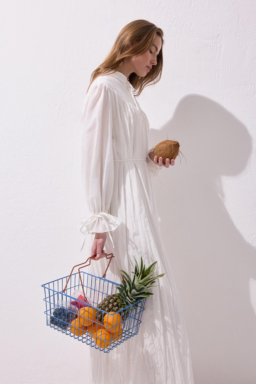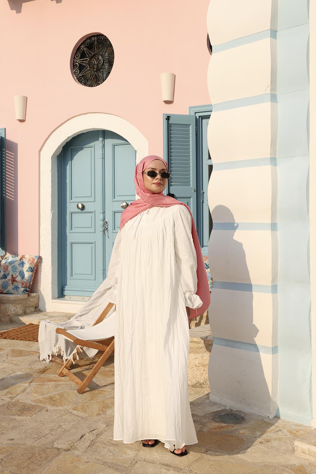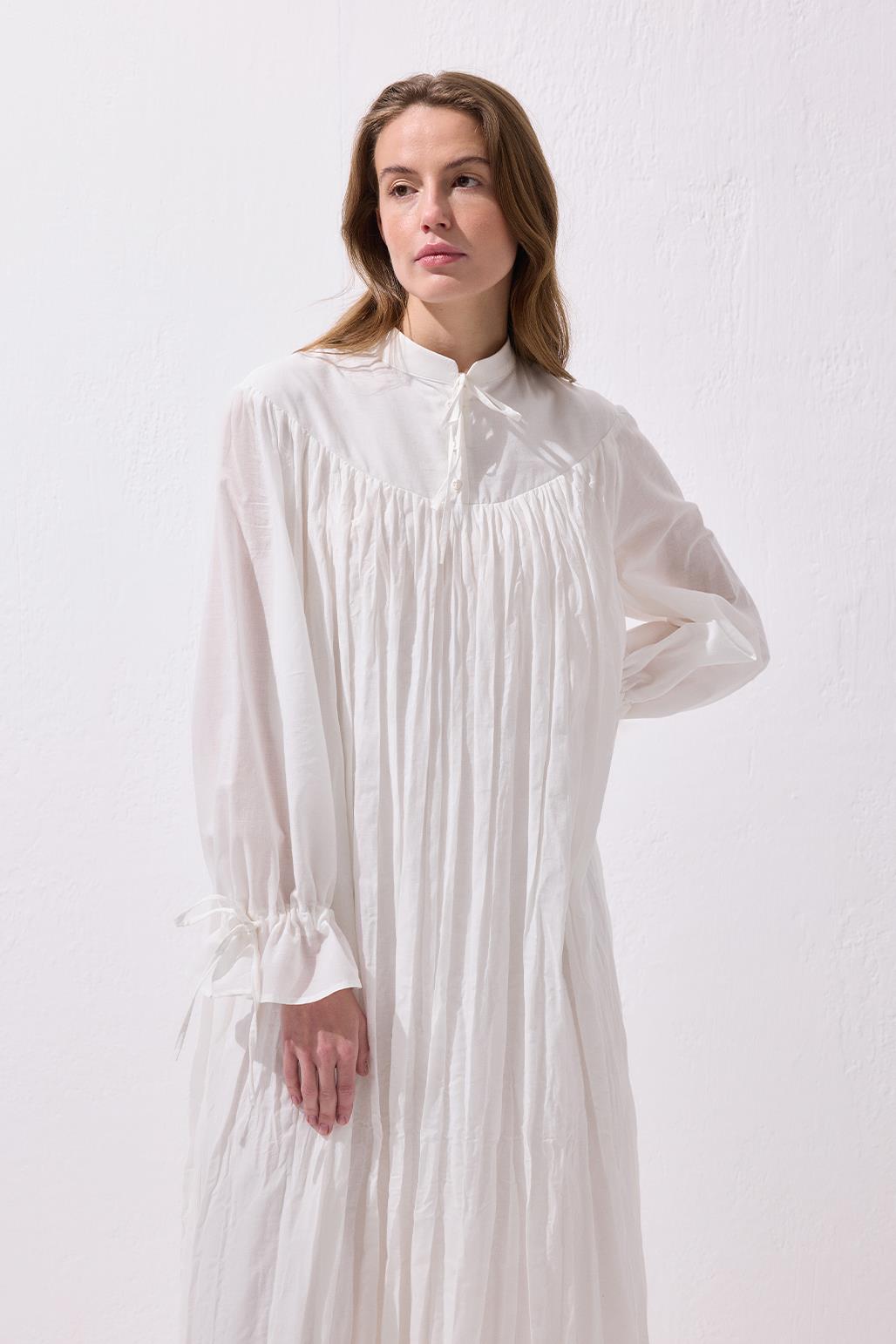 Crinkle-effect voile fabric, lined, high collar, raglan cut, low shoulder design, adjustable gathered sleeve cuffs, removable waist belt, long dress.