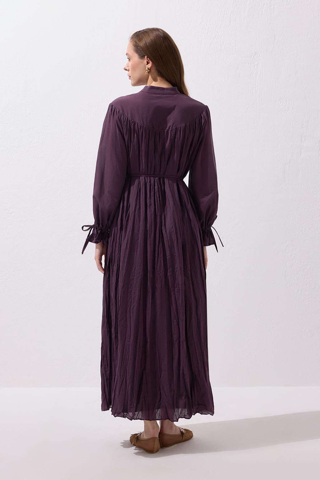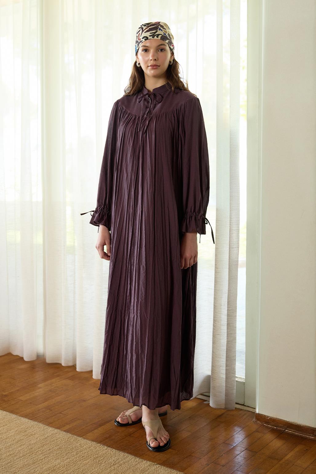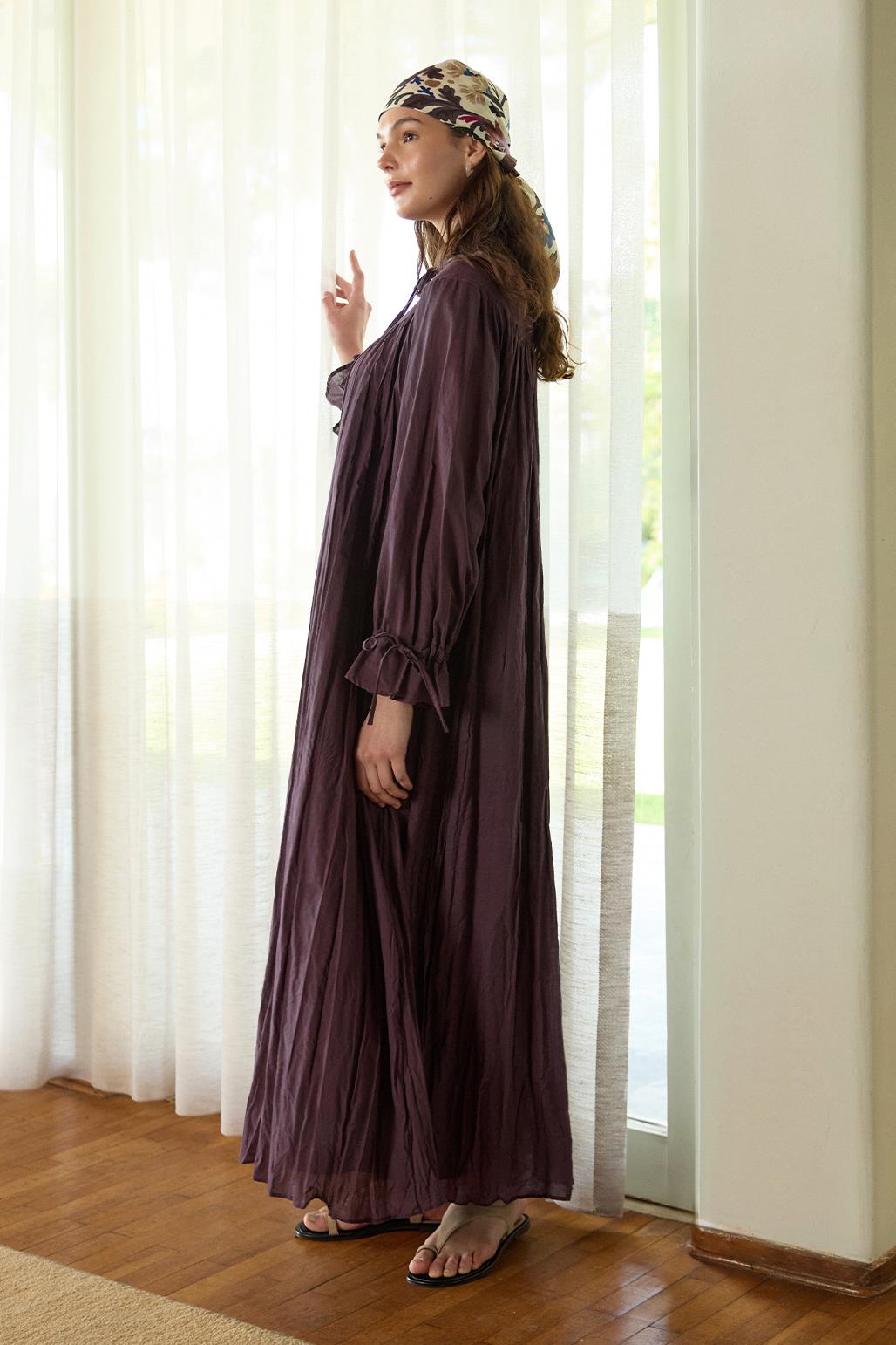 Crinkle-effect voile fabric, lined, high collar, raglan cut, low shoulder design, adjustable gathered sleeve cuffs, removable waist belt, long dress.
