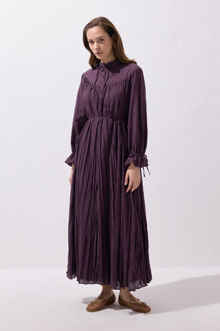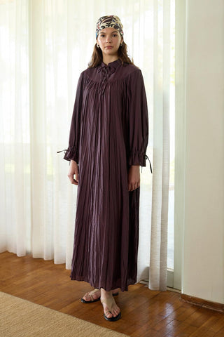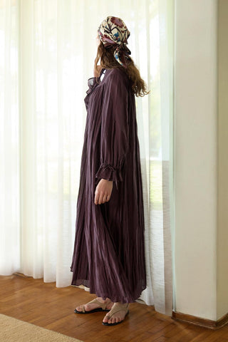 The Odri Crinkle Voile Maxi Dress in Plum combines modern design with a refined silhouette, offering the perfect balance of elegance and comfort. The crinkle-effect voile fabric provides a lightweight and graceful feel, ensuring comfort throughout the day while accentuating your figure with its form-fitting design. The low shoulder detail enhances the dress's elegant stance, while adjustable sleeve cuffs and a removable waist belt shape the dress beautifully around your body. The high collar and raglan cut details add a contemporary touch, making it ideal for both special occasions and everyday wear. With its unique fabric and chic design, this dress will quickly become a wardrobe staple.