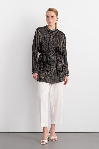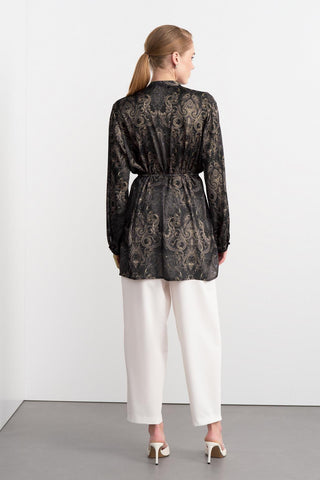 The Oli Patterned Shirt, crafted from drapey satin fabric, offers lightness and elegance while creating a strikingly refined look with its delicate pattern. The stand-up collar and bracelet cuffs give the shirt a modern and powerful stance. With the removable belt detail, you can create various styles, whether it's a daily chic look with slim-fit trousers or a sophisticated appearance with wide-leg pants. This piece is sure to become one of your wardrobe essentials in every season!