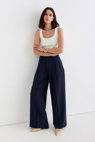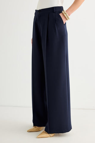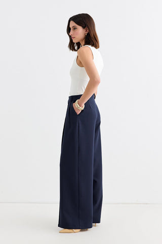 These Palazzo Wide Leg Trousers in Navy Blue offer comfort and elegance all day long with their stretchy, elastic fabric. The high-waisted design accentuates your waist, creating a longer and slimmer silhouette, while the wide-leg cut provides freedom of movement. The pleated details add an elegant touch, offering a flawless look suitable for any occasion, from everyday wear to special events. Pair it with a basic blouse or shirt for a simple style, or with a chic jacket for a modern look. A timeless piece that will find a place in your wardrobe for versatile use!