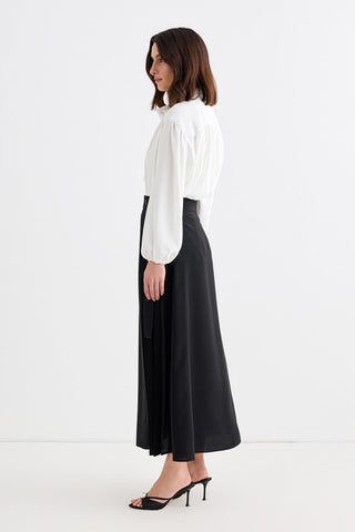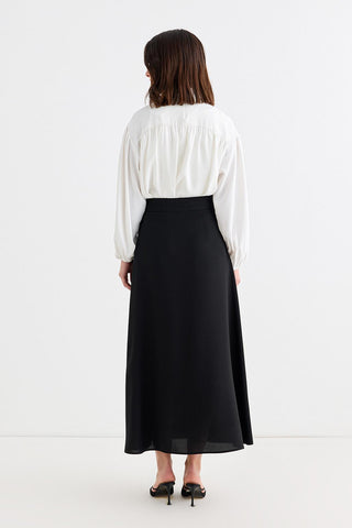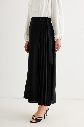The Rita Pleated Wrap Skirt offers comfortable elegance with its crepe blend soft textured fabric. Its high-waisted design accentuates the body's curves while the long cut elongates the legs. The pleated details add movement to the skirt, and its minimalist design allows for easy pairing with various outfits. You can create a simple style for everyday wear with a basic shirt and flat shoes, or pair it with a stylish blouse and heels for an elegant look on special occasions. With its timeless design, it will become a staple piece in your wardrobe.