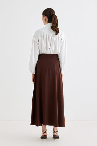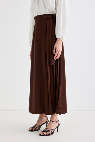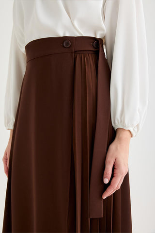 The Rita Pleated Wrap Skirt offers comfortable elegance with its crepe blend soft textured fabric. Its high-waisted design accentuates the body's curves while the long cut elongates the legs. The pleated details add movement to the skirt, and its minimalist design allows for easy pairing with various outfits. You can create a simple style for everyday wear with a basic shirt and flat shoes, or pair it with a stylish blouse and heels for an elegant look on special occasions. With its timeless design, it will become a staple piece in your wardrobe.