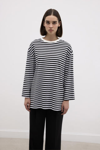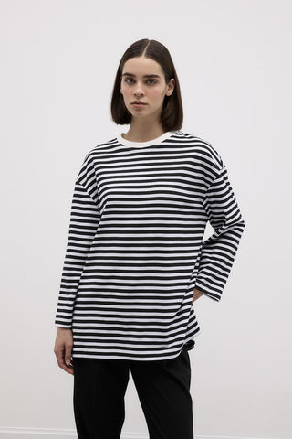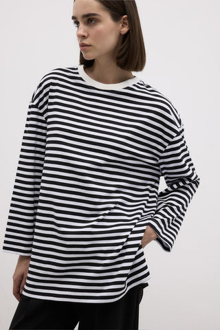 This striped slit cotton knit blouse in black is designed with modern stripes and slit details, making it both trendy and timeless. The relaxed fit ensures all-day comfort and the minimal style will go easily with any outfit.