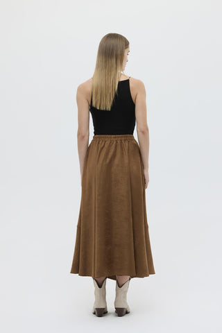 The flared skirt with suede stitching detail in tan captures attention with its high-quality suede fabric and elegant stitching, creating a retro and bohemian vibe. Elevate your style by pairing it with patterned coats, textured knitwear, boots, or flat shoes. It is an ideal piece for both stylish and comfortable outfits.