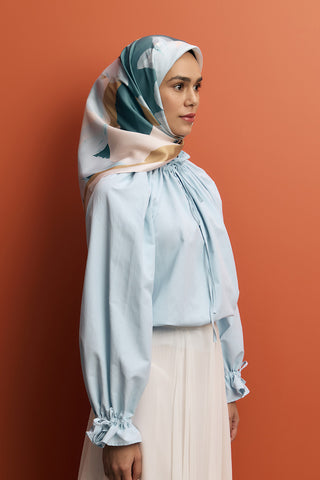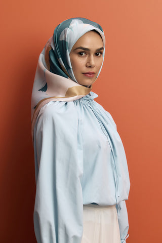 Twill Silk Square Scarf Floral Soft Blue
