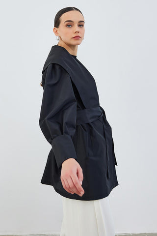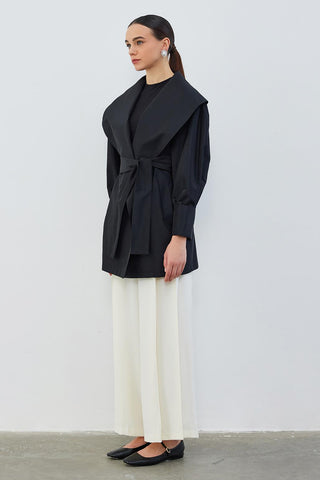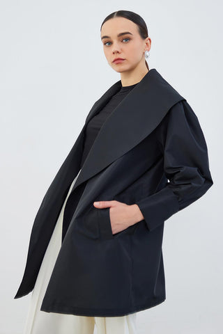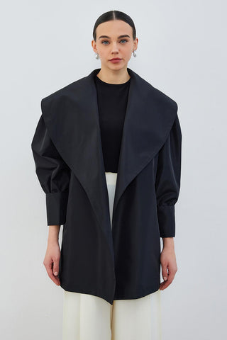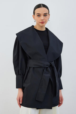 The Vera Taffeta Shawl Collar Kimono in black enhances elegance for both everyday wear and special occasions with its broad collars and refined fabric accents. Its modern design and robust presence allow you to define your waistline with its double-breasted front and adjustable belt. Taffeta's glossy, luxurious texture adds a touch of sophistication. Pair it with wide-leg trousers or straight-cut jeans for a daily elegance that's effortlessly chic.